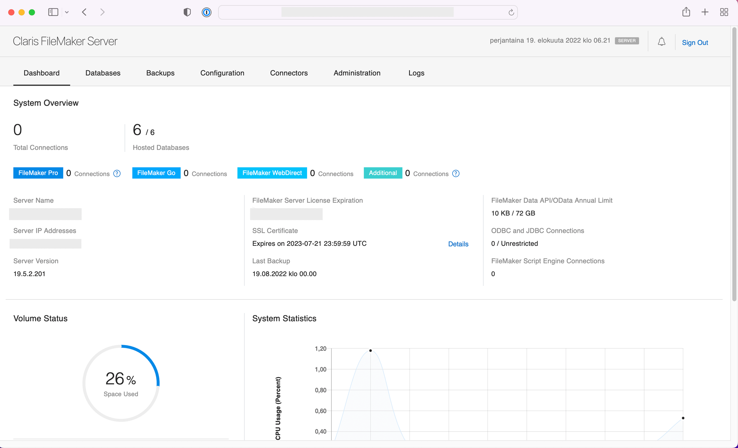 FileMaker Serveriä voin konfiguroida selainkäyttöliittymästä. Selaimella voi muun muassa avata ja sulkea tietokantoja, asentaa SSL-sertifikaatin, luoda varmuuskopioinnin aikataulut, määritellä palvelimella ajettavia ajastettuja skriptejä. FileMaker Serverillä voi myös avata FileMaker Data API -REST-rajapinnan tietokantaan, joka mahdollistaa integraatiot muista liiketoiminnalle tärkeistä ohjelmistoista.